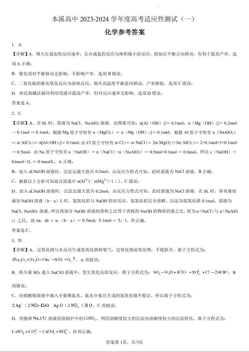 本溪高中2023-2024学年度高考适应性测试(一)化学参考答案