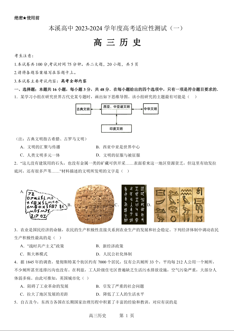 本溪高中2023-2024学年度高考适应性测试(一)历史试题