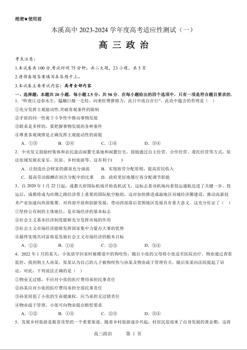 本溪高中2023-2024学年度高考适应性测试(一)政治试题