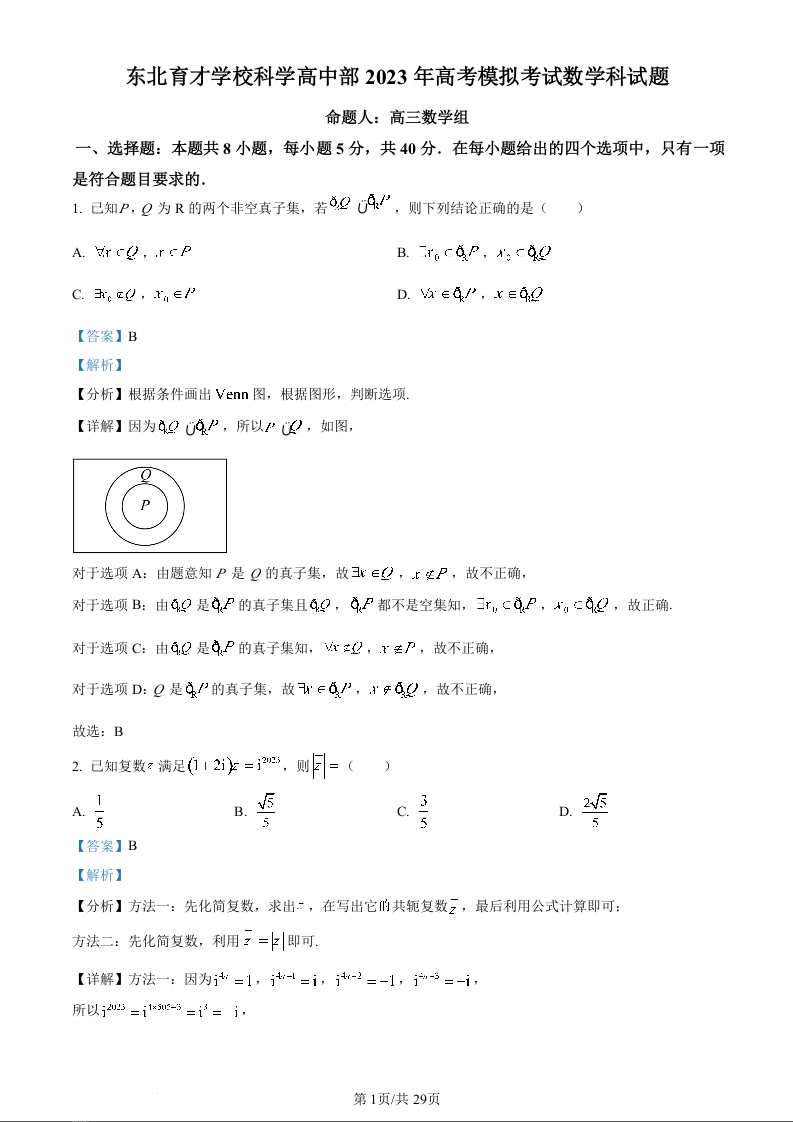 2023届辽宁省东北育才学校科学高中部高三最后一次模拟考试 数学答案