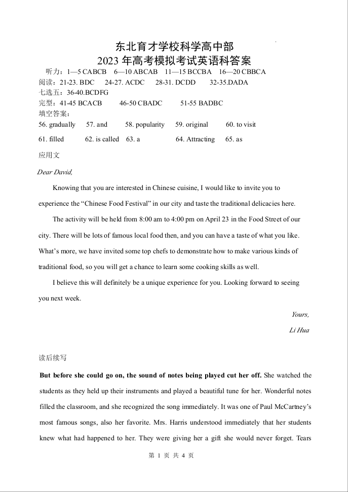 2023届辽宁省东北育才学校科学高中部高三最后一次模拟考试 英语答案