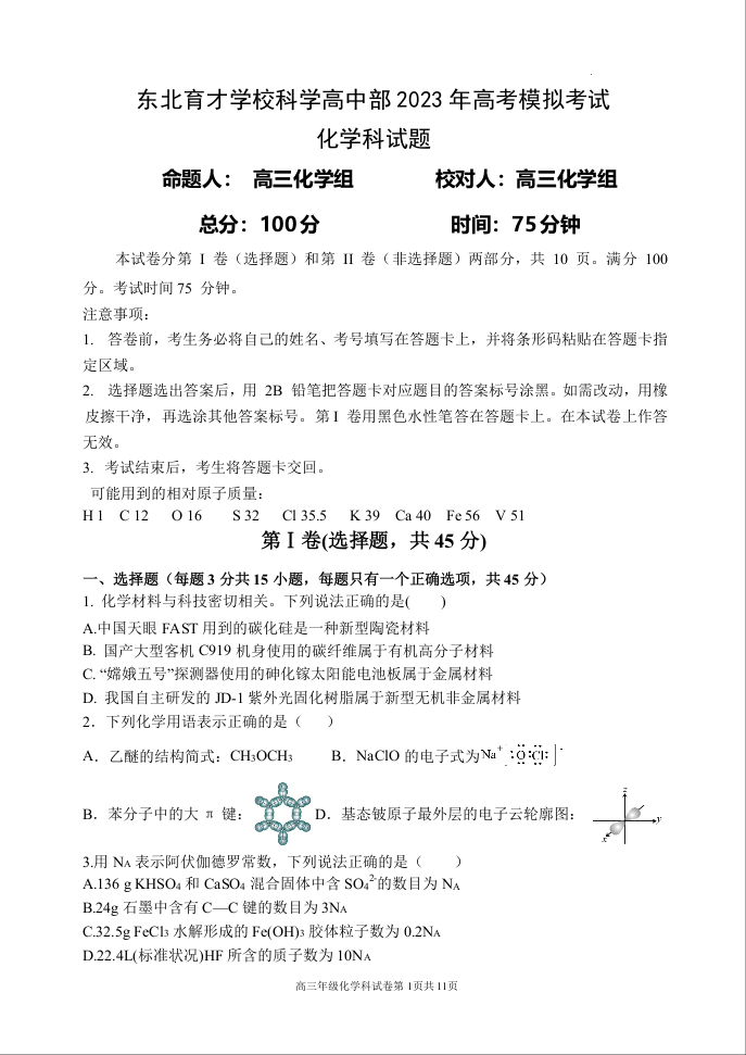 2023届辽宁省东北育才学校科学高中部高三最后一次模拟考试 化学