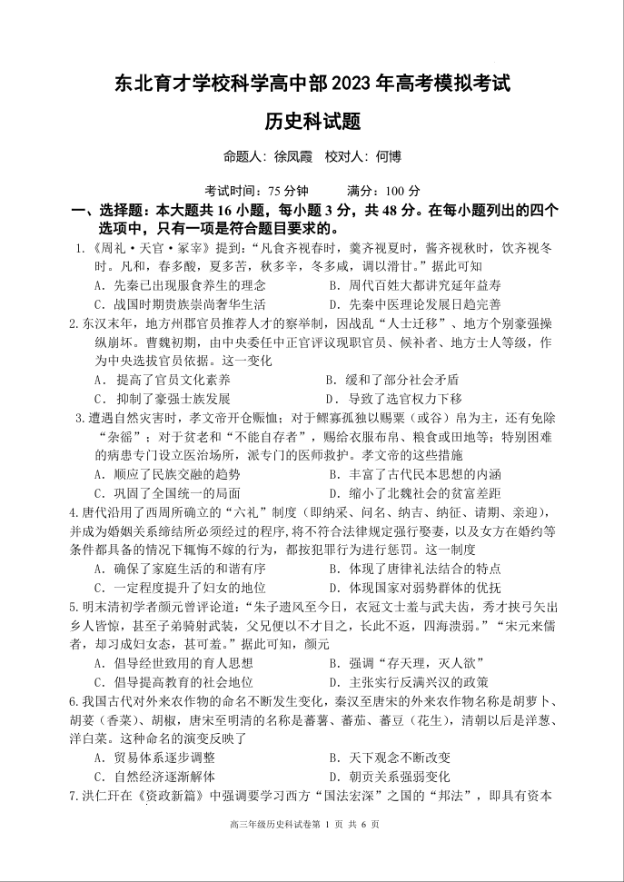2023届辽宁省东北育才学校科学高中部高三最后一次模拟考试 历史