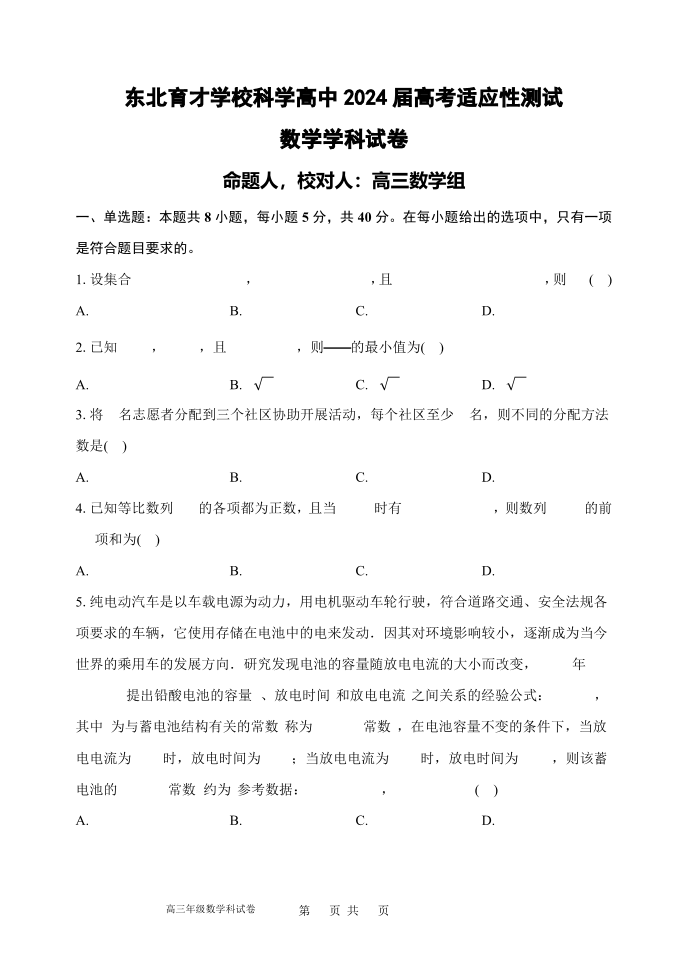 2024届辽宁省东北育才学校科学高中部高三下学期适应性测试+数学