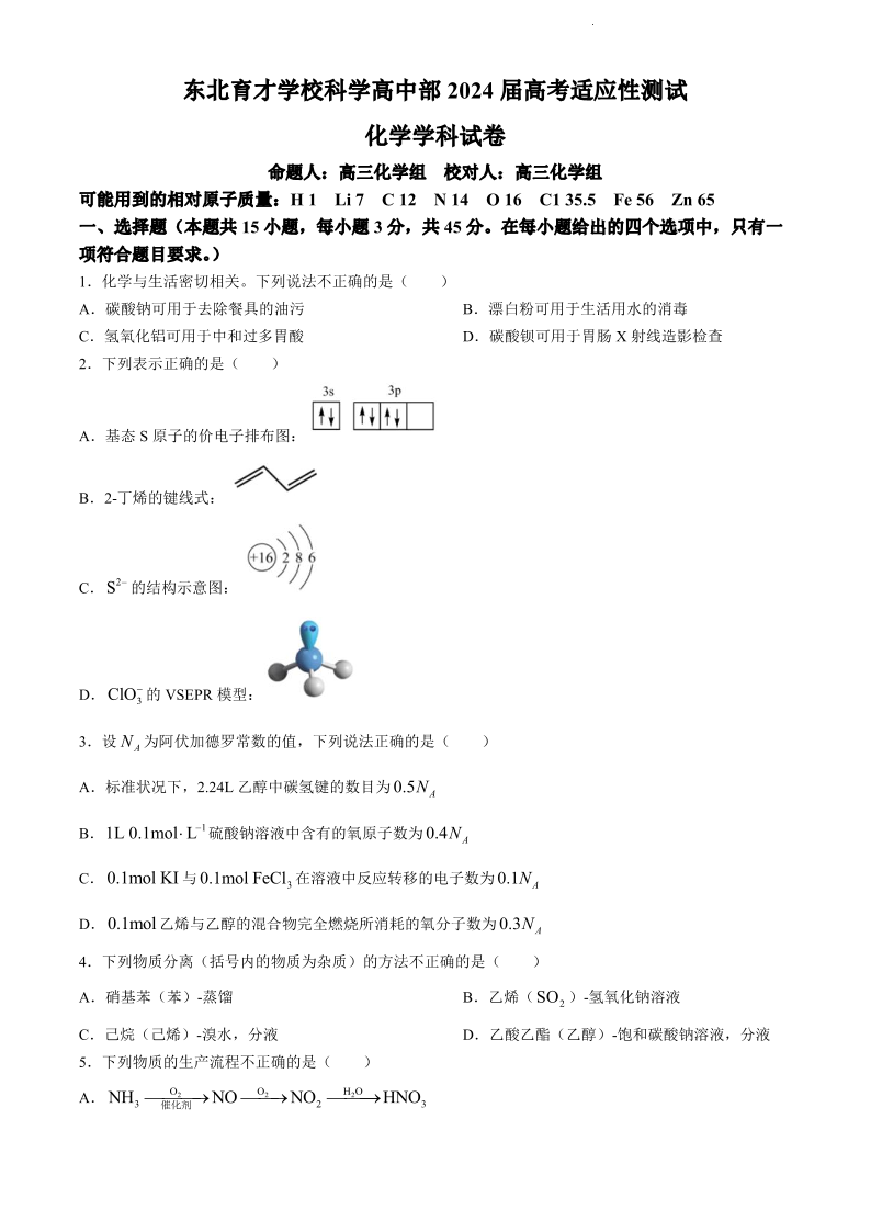 2024届辽宁省东北育才学校科学高中部高三下学期适应性测试+化学