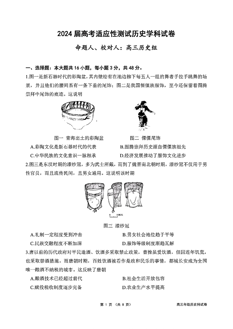 2024届辽宁省东北育才学校科学高中部高三下学期适应性测试+历史