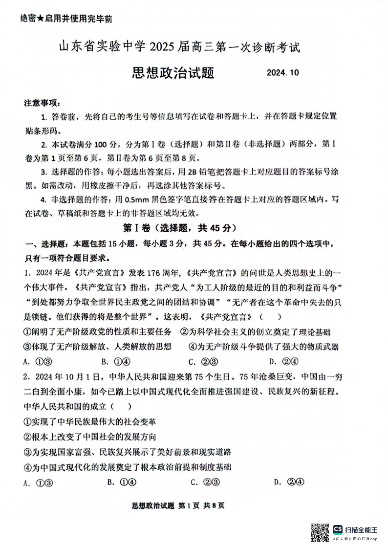 山东省实验中学2025届高三第一次诊断考试+政治