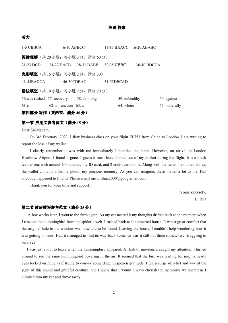 山西大学附属中学2023届高三下学期5月月考 英语答案