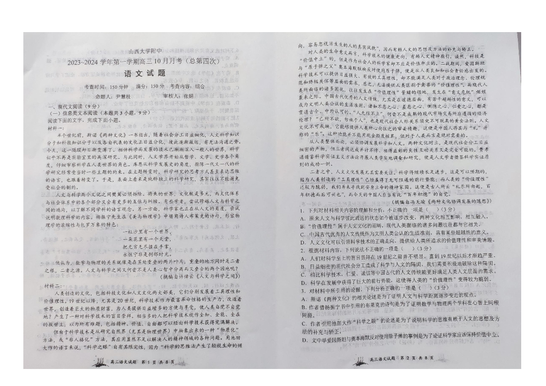 山西大学附属中学2023-2024学年高三上学期10月月考 语文