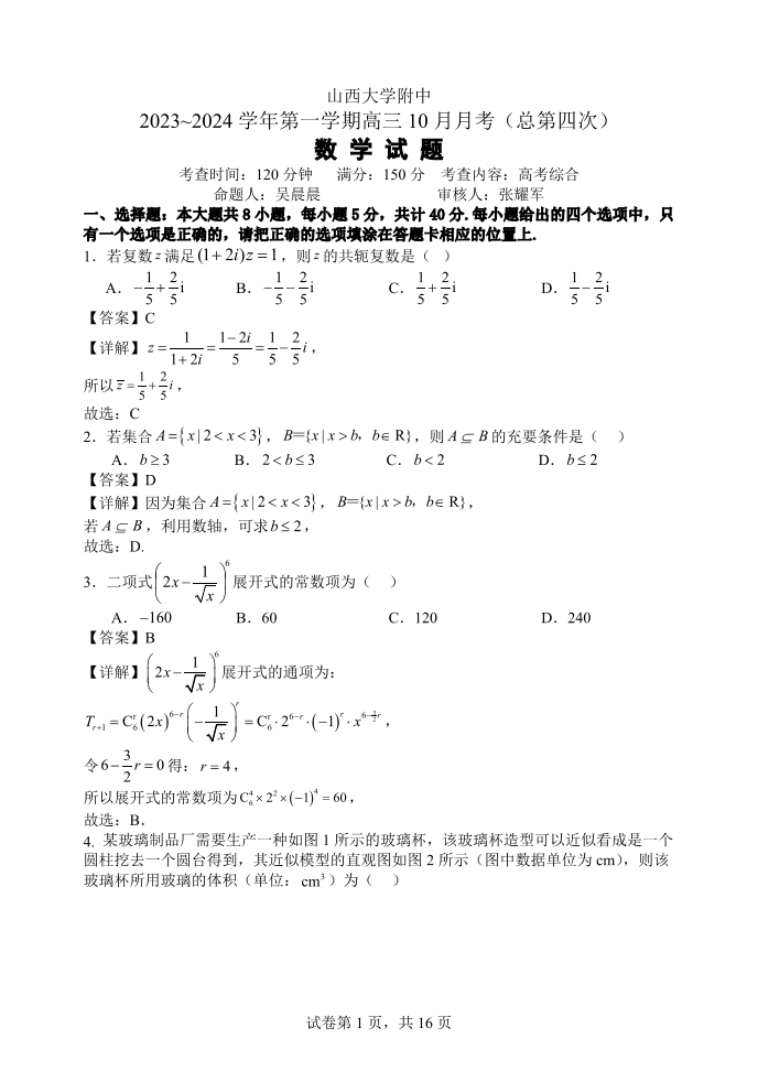 山西大学附属中学2023-2024学年高三上学期10月月考 数学答案