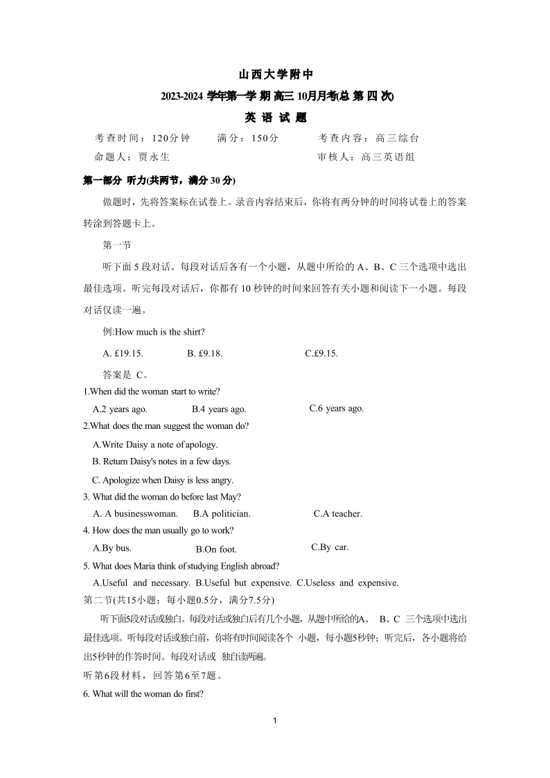 山西大学附属中学2023-2024学年高三上学期10月月考 英语