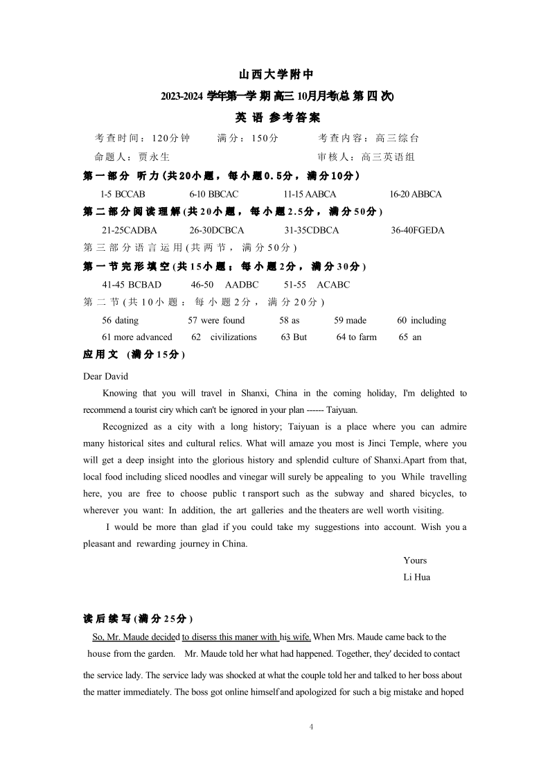 山西大学附属中学2023-2024学年高三上学期10月月考 英语答案