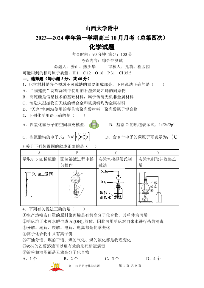 山西大学附属中学2023-2024学年高三上学期10月月考 化学