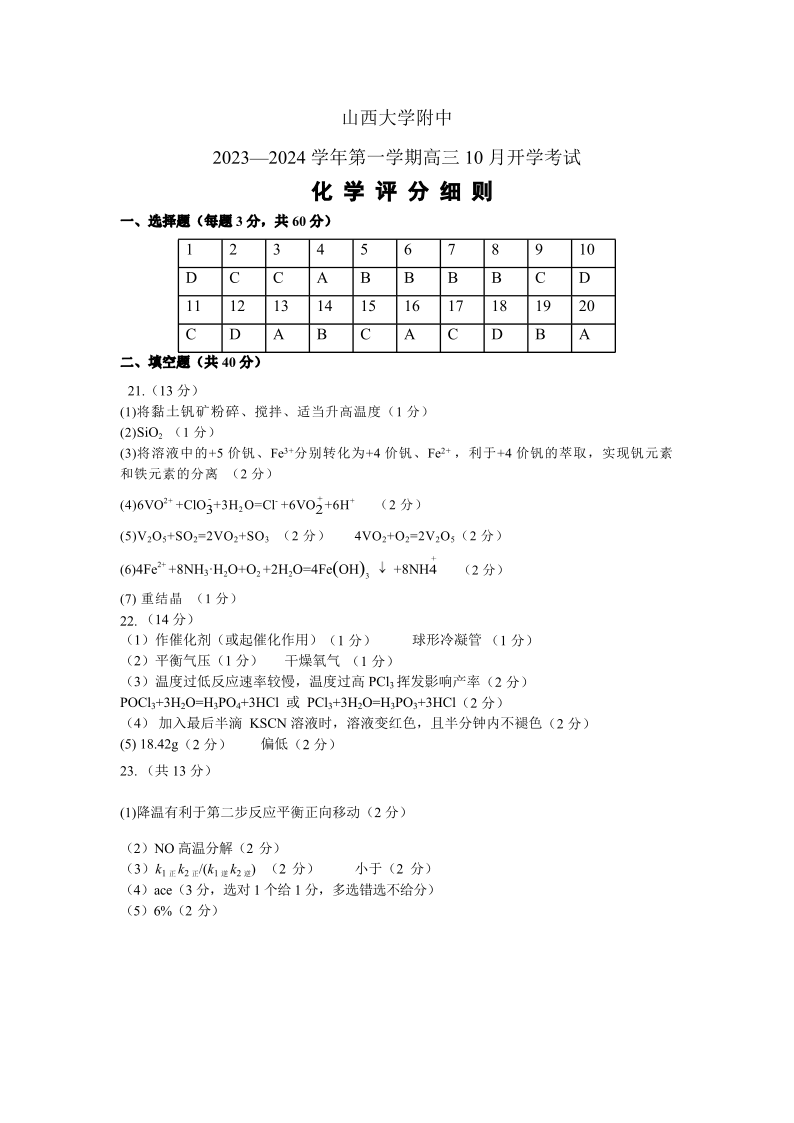 山西大学附属中学2023-2024学年高三上学期10月月考 化学答案