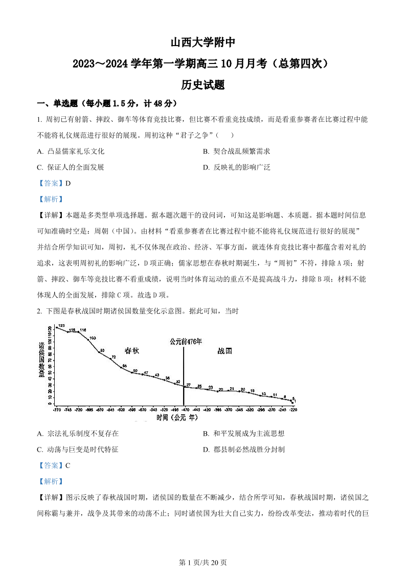 山西大学附属中学2023-2024学年高三上学期10月月考 历史答案