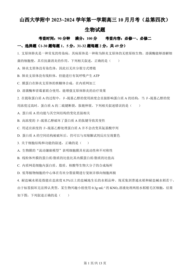 山西大学附属中学2023-2024学年高三上学期10月月考 生物