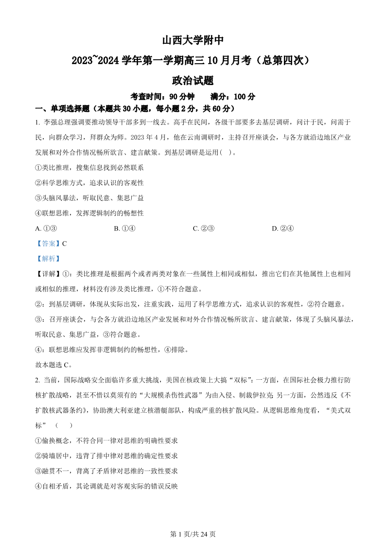 山西大学附属中学2023-2024学年高三上学期10月月考 政治答案