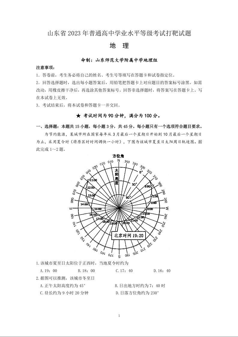 山东师大附中2023.6高三年级考前模拟检测地理答案