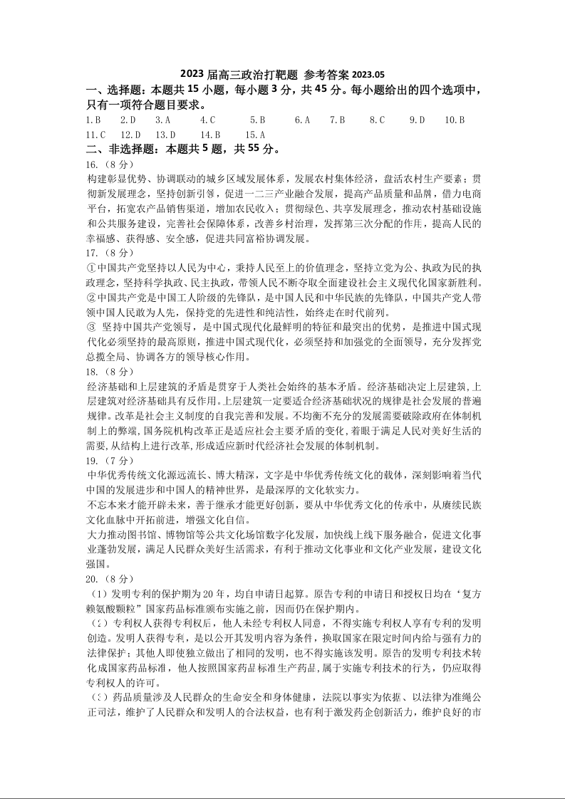 山东师大附中2023.6高三年级考前模拟检测政治答案