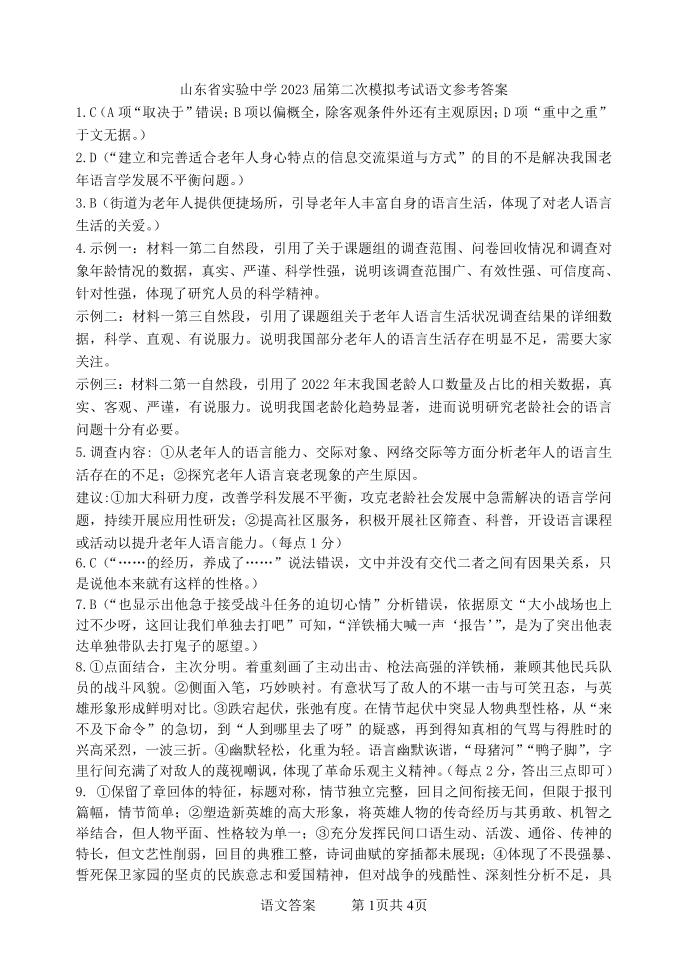1山东省实验中学2023.6高三年级考前模拟语文答案
