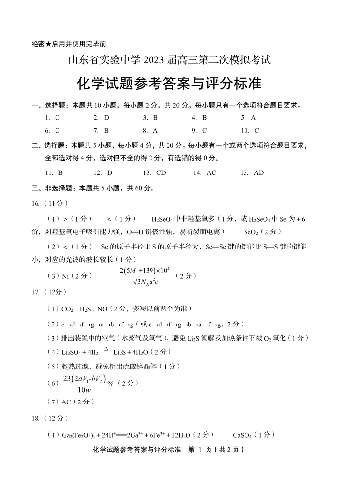 山东省实验中学2023.6高三年级考前模拟化学答案