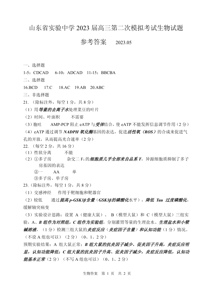 山东省实验中学2023.6高三年级考前模拟生物答案