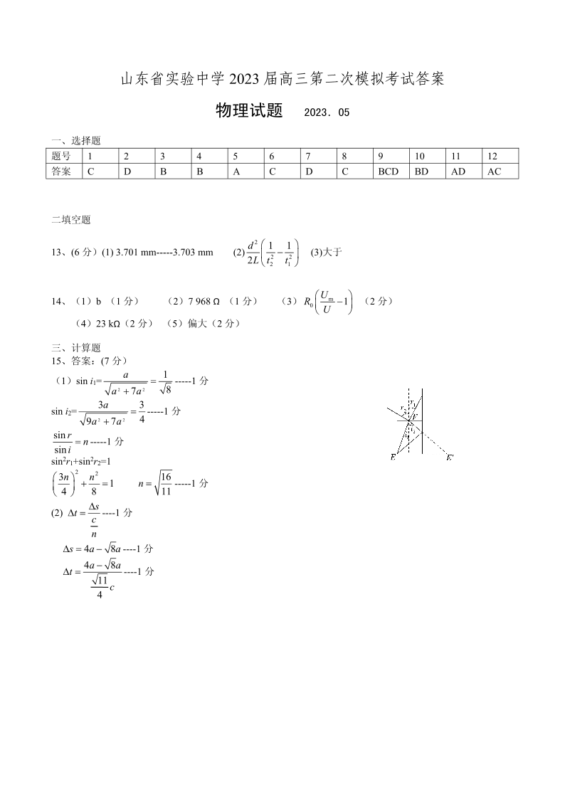 山东省实验中学2023.6高三年级考前模拟物理答案