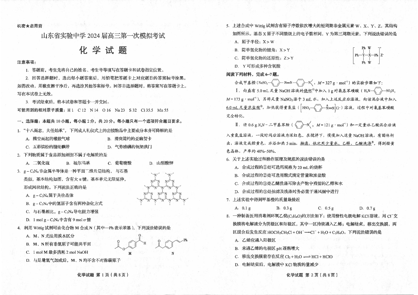 山东省实验中学2024.4高三年级第一次模拟化学