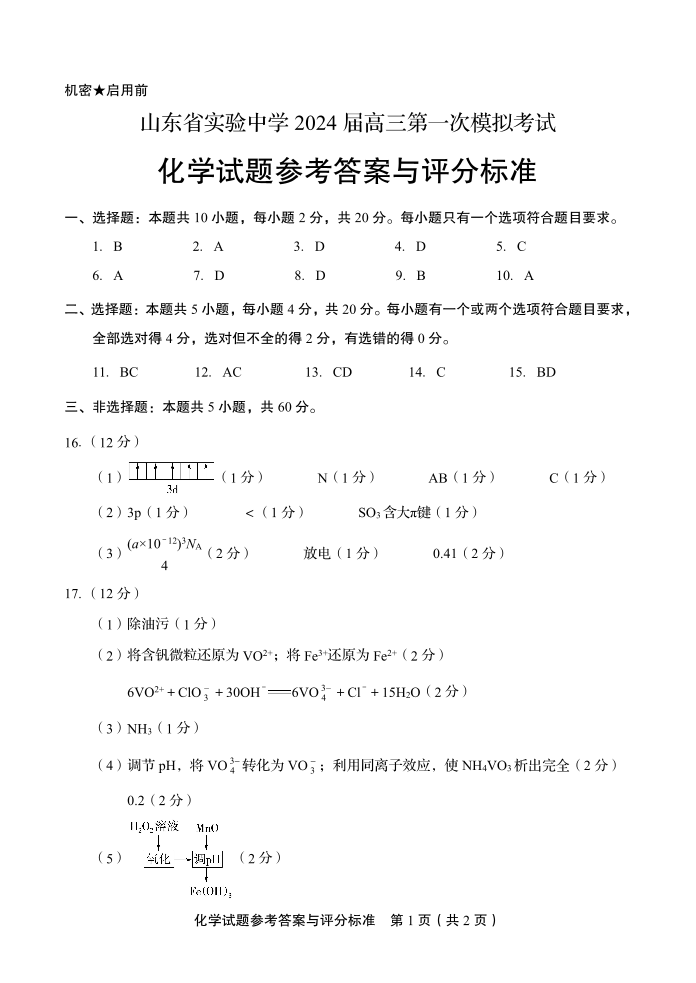 山东省实验中学2024.4高三年级第一次模拟化学答案
