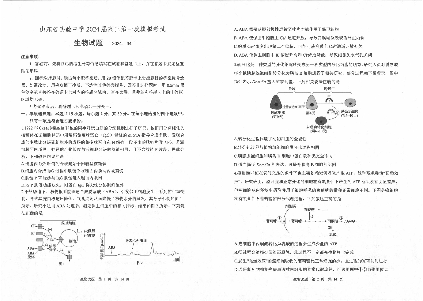 山东省实验中学2024.4高三年级第一次模拟生物