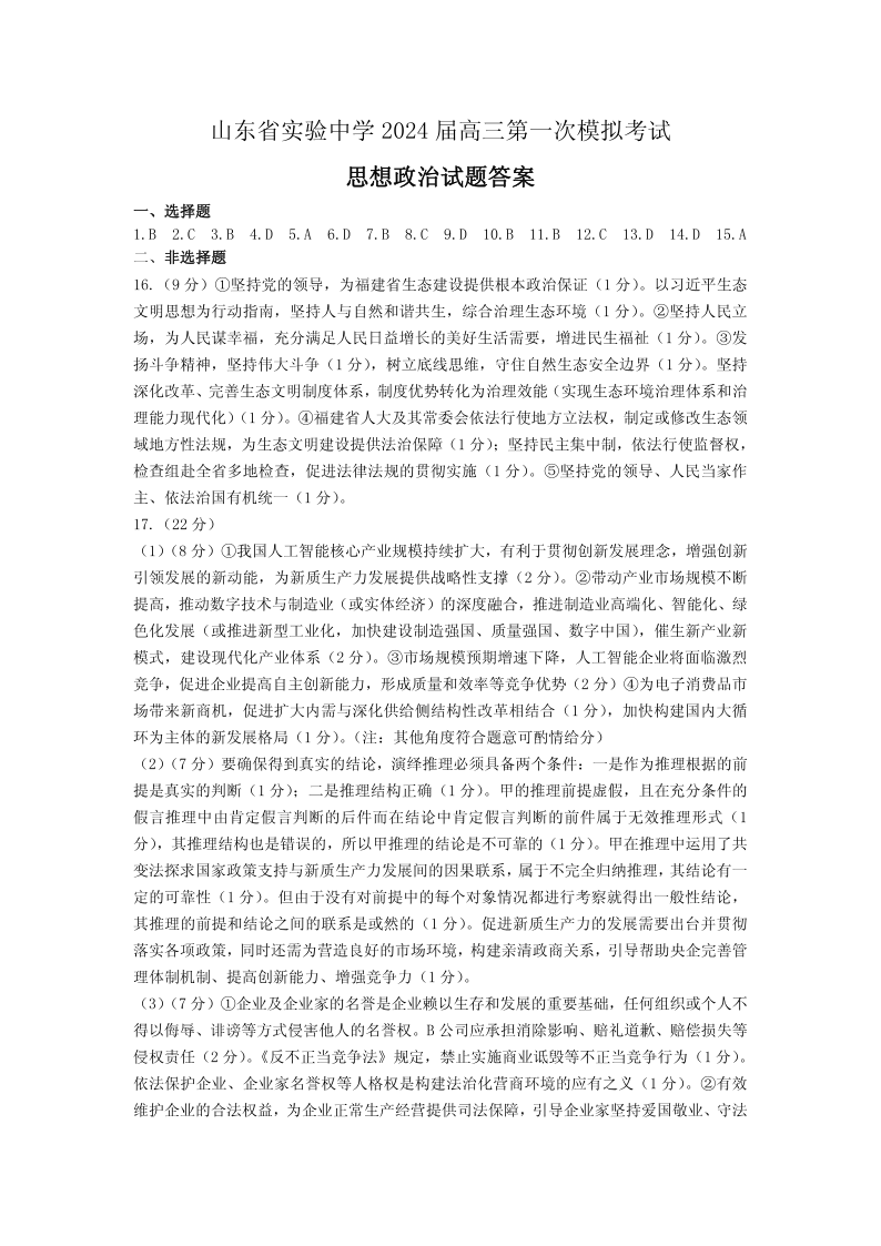 山东省实验中学2024.4高三年级第一次模拟政治答案