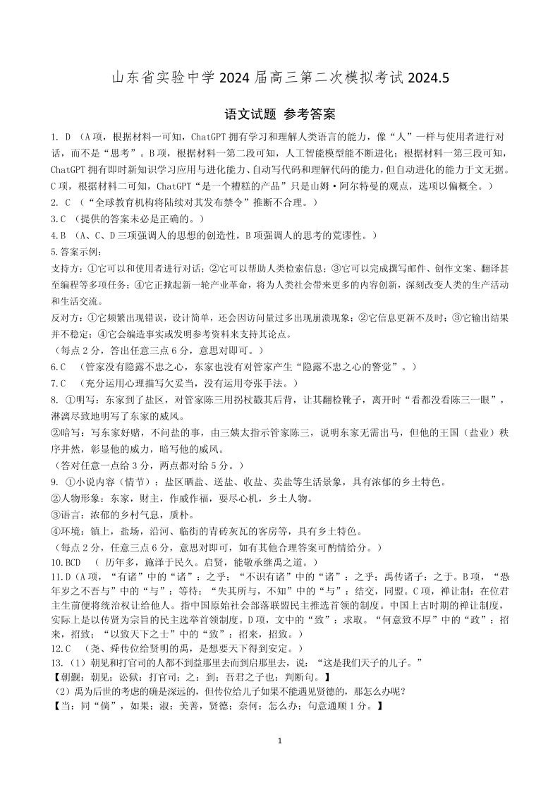1山东省实验中学2024.6高三年级考前模拟语文答案