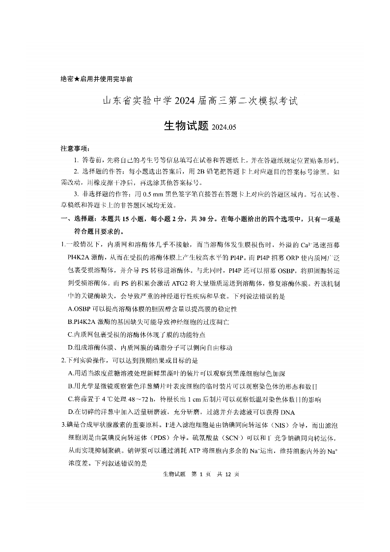 山东省实验中学2024.6高三年级考前模拟生物