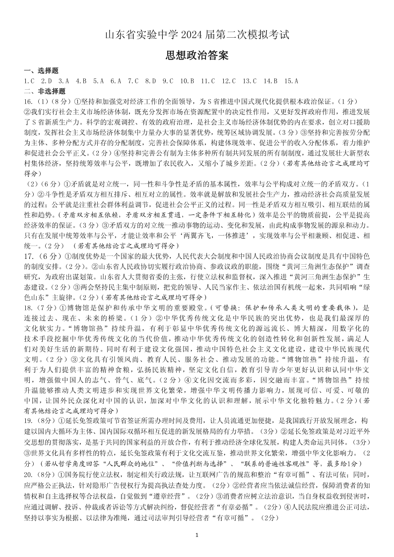 山东省实验中学2024.6高三年级考前模拟政治答案