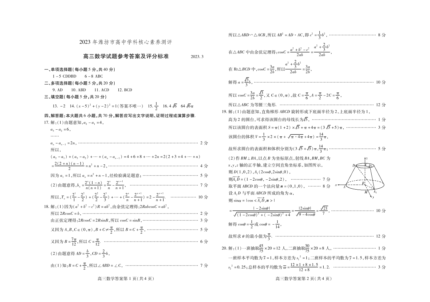 山东省潍坊市2023.3高三年级优生素养测评数学答案