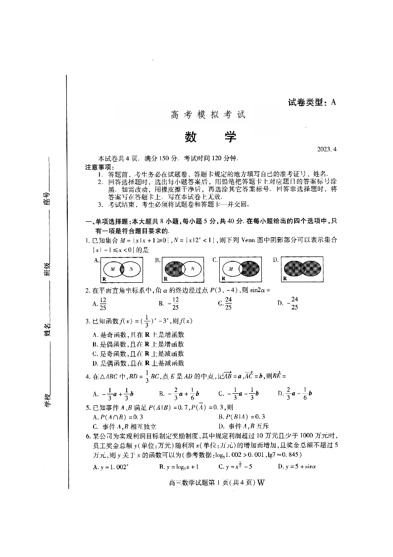 山东省潍坊市2023.4高三年级第二次模拟考试数学