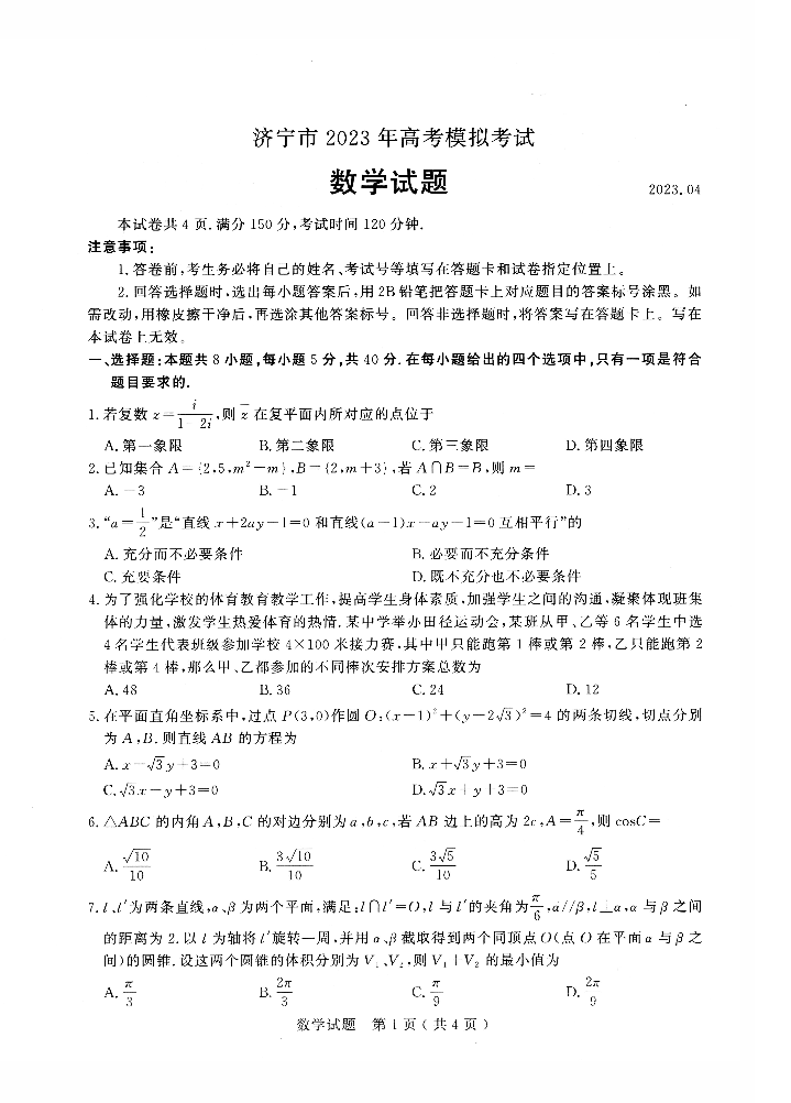 山东省济宁市2023.4高三年级第二次模拟考试数学