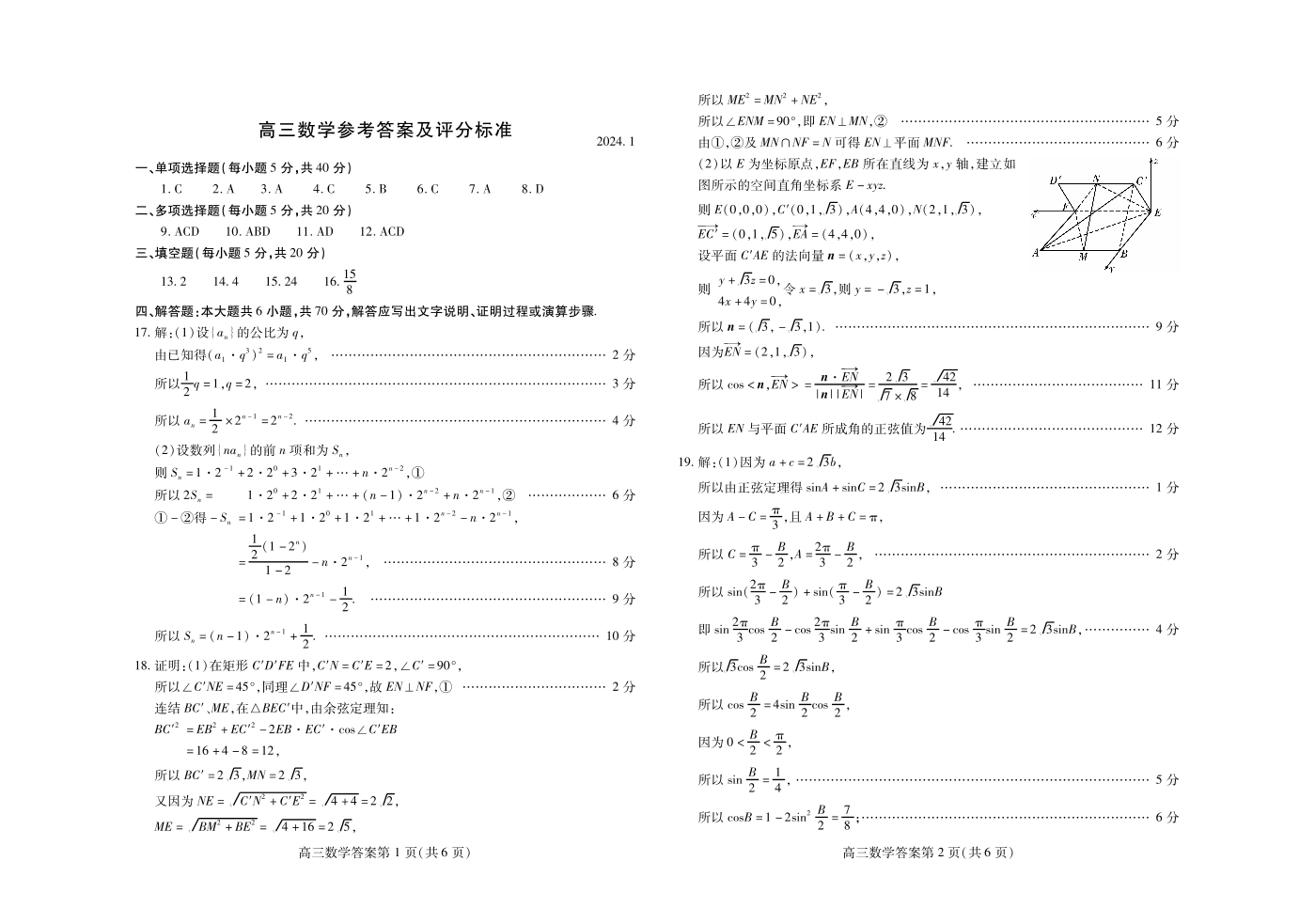 山东省潍坊市2024.1高三年级期末考试数学答案