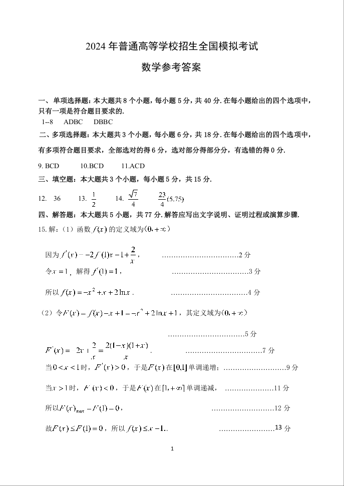 2山东省潍坊市区域2024.6高三年级考前热身卷数学答案