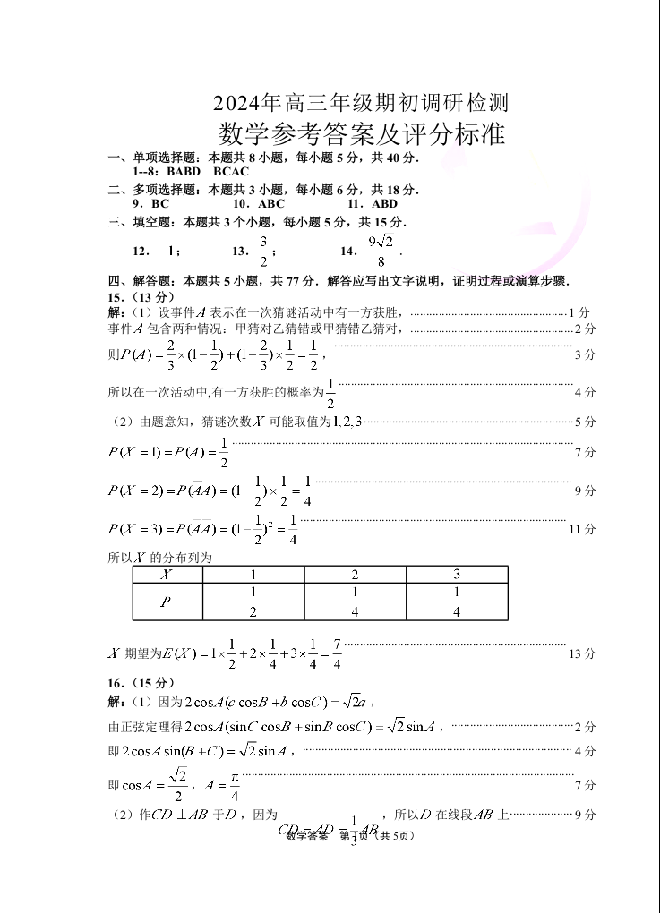 山东省青岛市2024.9高三期初调研试题数学答案