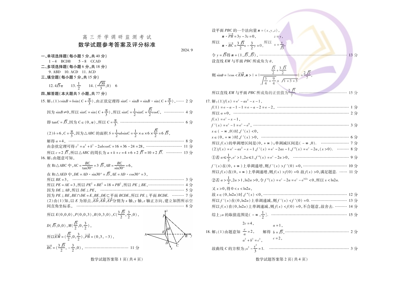 山东省潍坊市2024.9高三开学调研监测试题数学答案