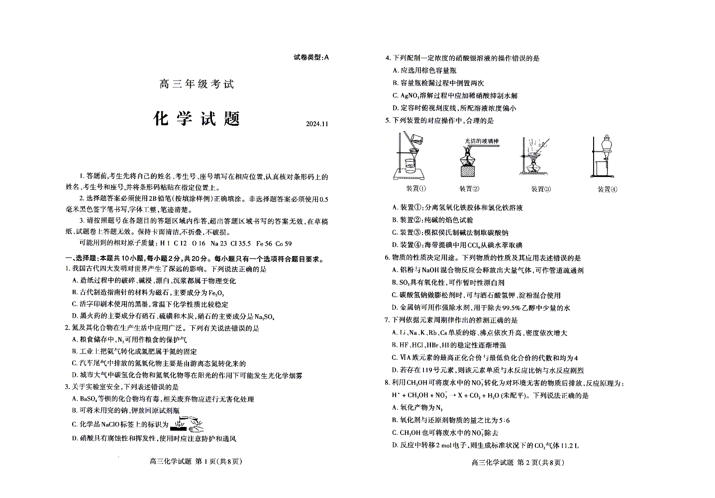 山东省泰安市2024.11高三年级期中考试化学