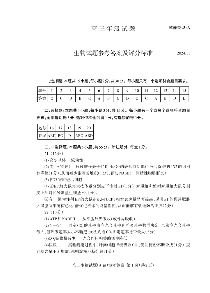 山东省泰安市2024.11高三年级期中考试生物答案
