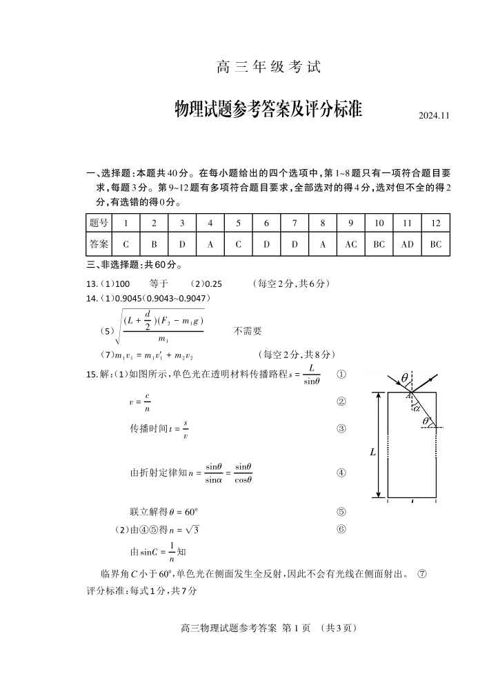 山东省泰安市2024.11高三年级期中考试物理答案