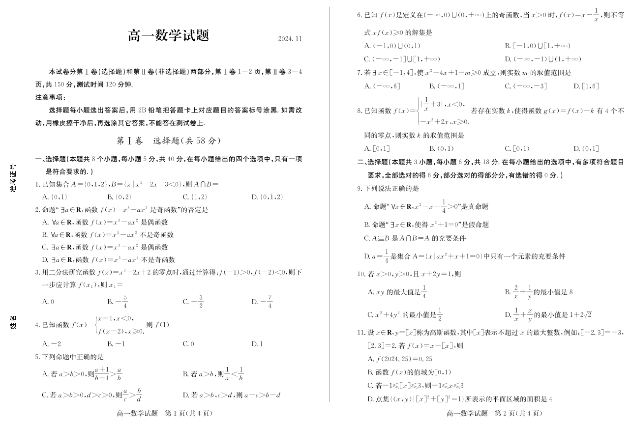 山东省德州市2024.11高一年级期中统一检测试题数学