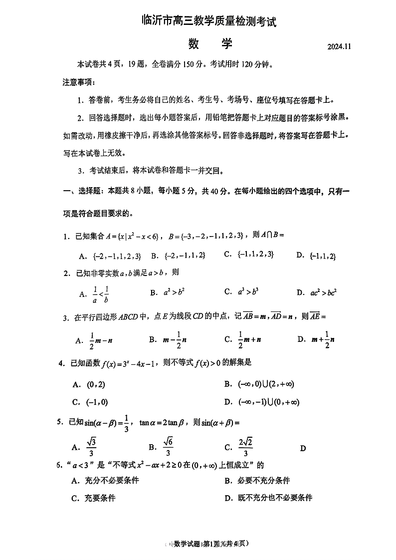 临沂市2025.11高三年级期中教学质量检测考+数学
