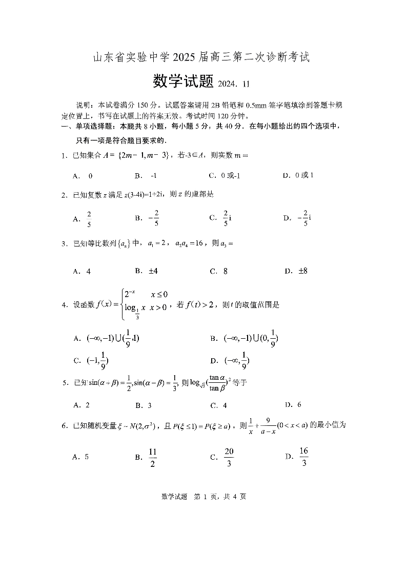 山东省实验中学2025届高三上学期11月期中考试++数学试题