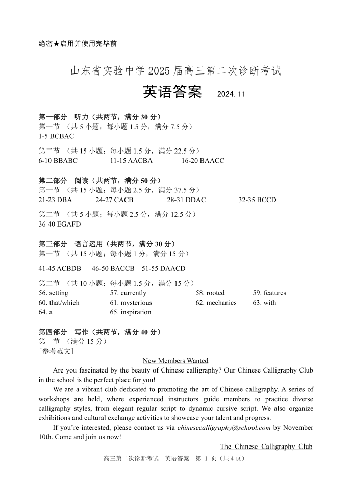 山东省实验中学2024.11高三年级第二次诊断考试英语答案