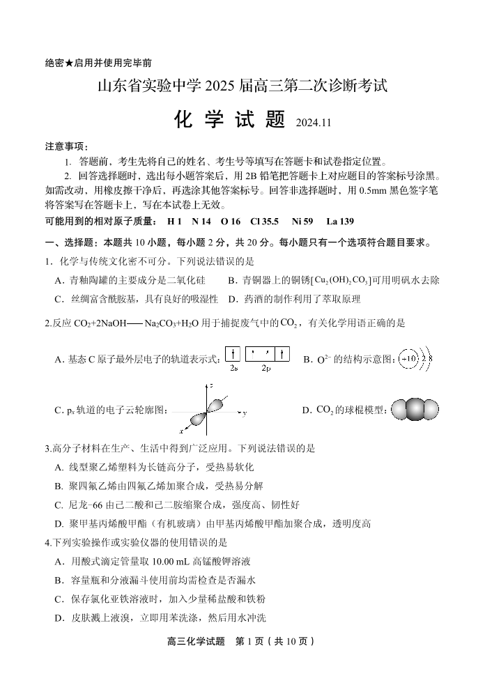 山东省实验中学2024.11高三年级第二次诊断考试化学