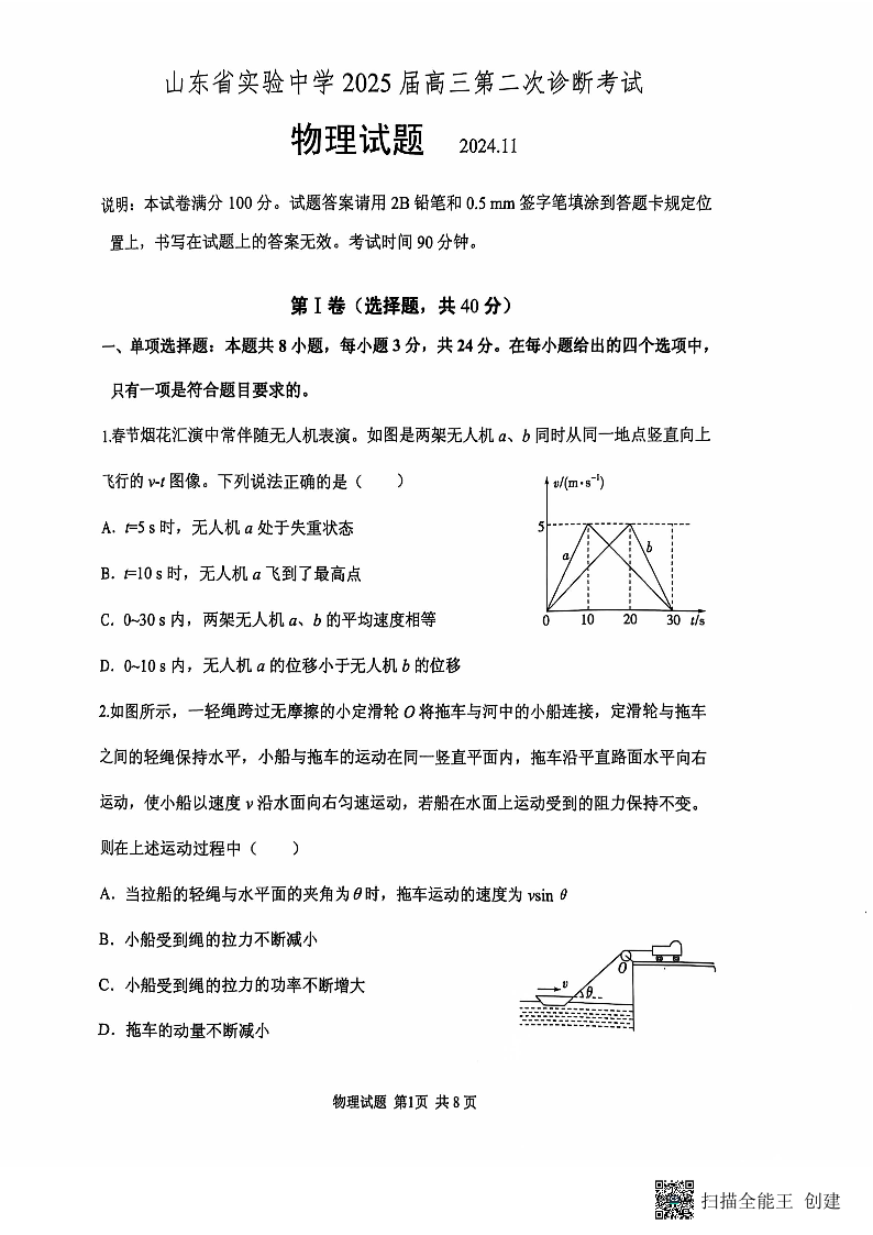 山东省实验中学2024.11高三年级第二次诊断考试物理